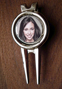 1 magnetic quarter-sized photo golf ball marker (no peg), hefty durable metal divot tool with magnet, packaged in a clear PVC gift pouch. Belt clip with recessed area for your thumb makes ball mark repairs easy. WAS $11.95. NOW $6